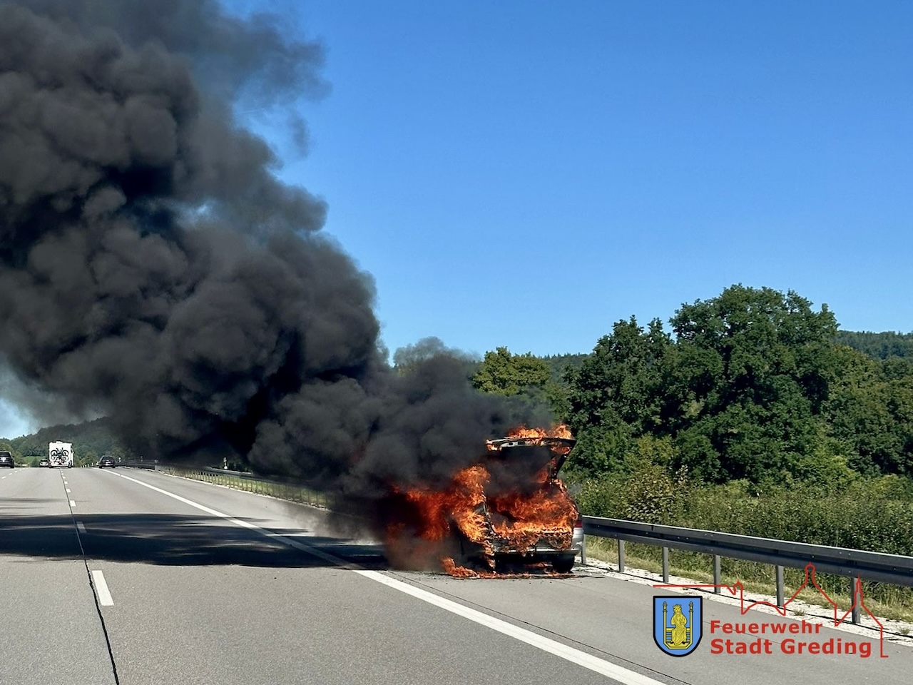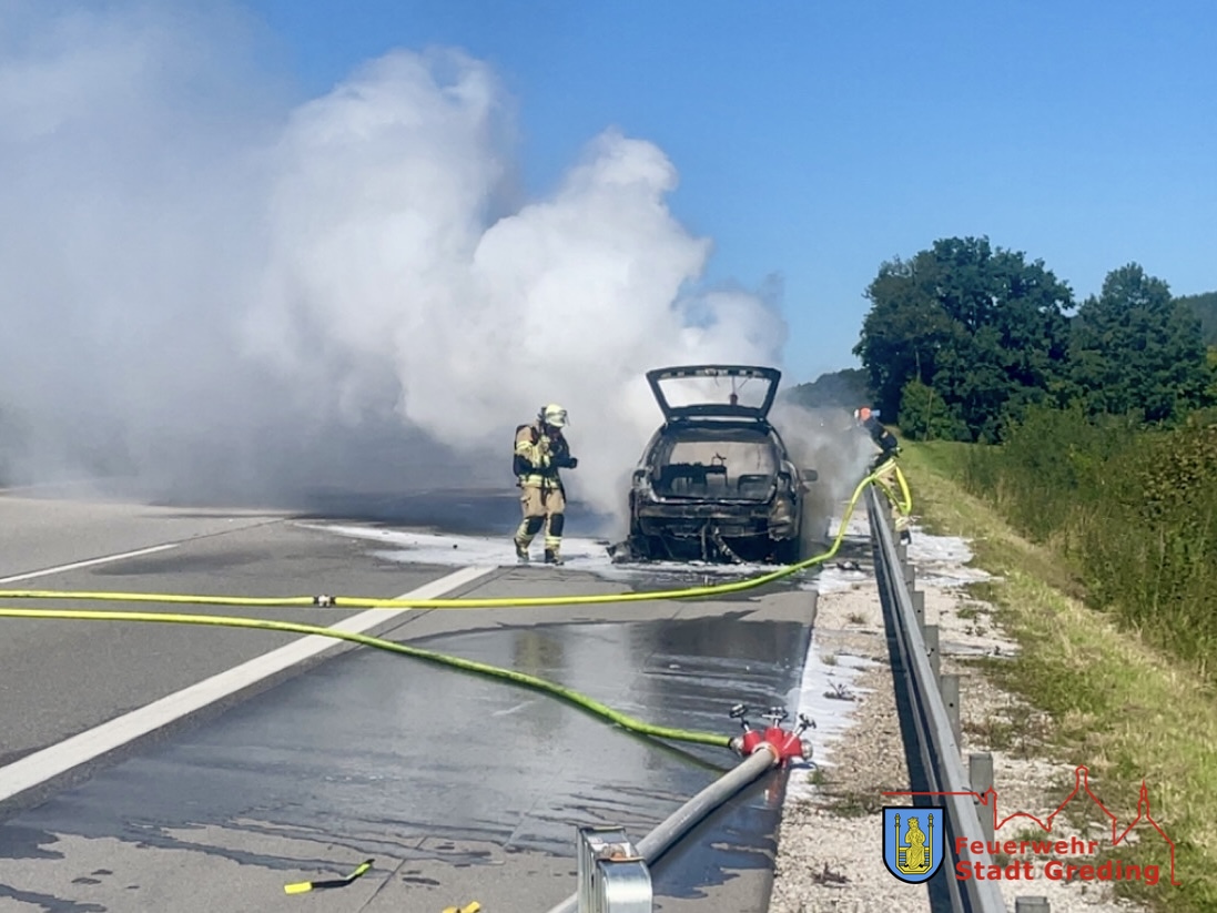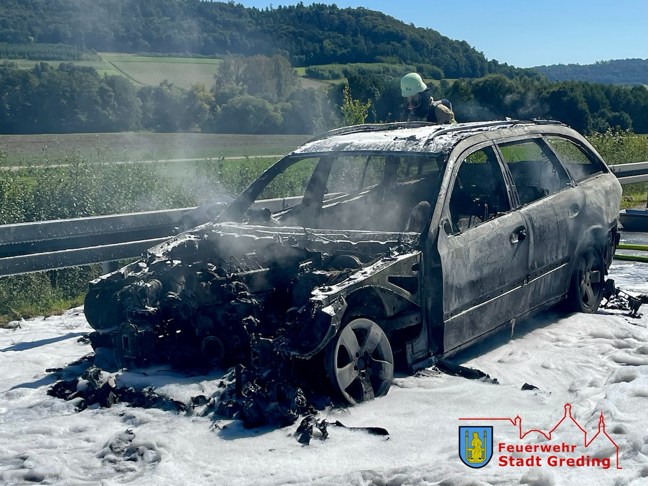 Zu einem brennenden Fahrzeug wird die Feuerwehr Greding am Freitagmittag auf die A9 alarmiert. Zwischen den Anschlussstellen Greding und Hilpoltstein steht ein KFZ auf dem Standstreifen in Vollbrand. Ein Trupp unter Atemschutz kann das Feuer rasch ablöschen. Während der Löscharbeiten muss die Autobahn in Fahrtrichtung Nürnberg komplett gesperrt werden. Nach rund zweieinhalb Stunden kann der Einsatz für die 20 Feuerwehrleute beendet werden.