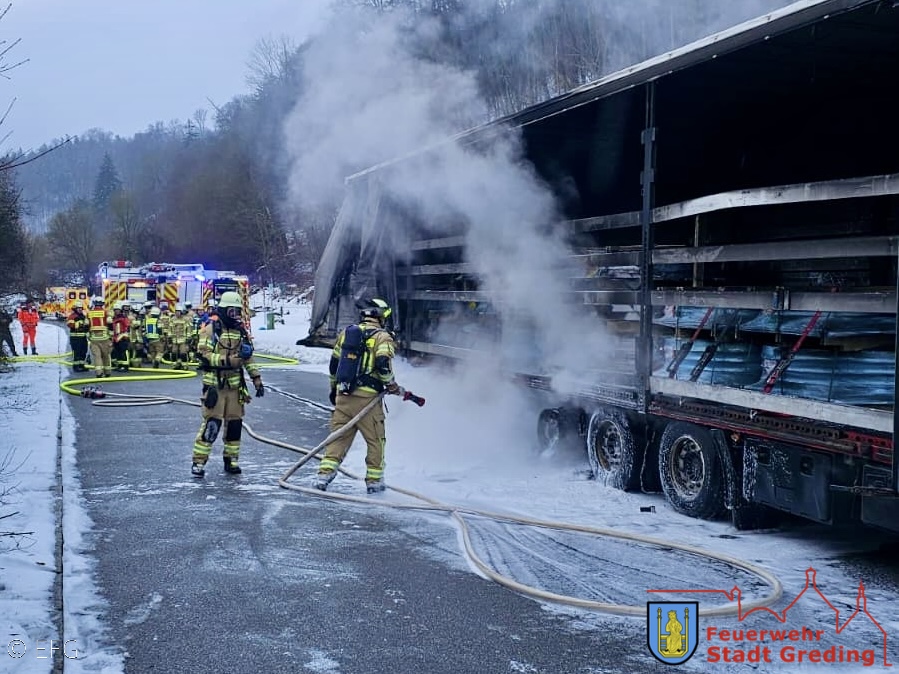 Ein Trupp unter Atemschutz kann das Feuer schnell bekämpfen und eine weitere Ausbreitung auf die gesamte Ladung verhindern. Um ungestört die Löschmaßnahmen durchführen zu können, wird der Parkplatz während den Arbeiten durch die Feuerwehr gesperrt. Im Einsatz waren neben der Feuerwehr Greding mit 25 Einsatzkräften, der Rettungsdienst, die Polizei und Vertreter der Kreisbrandinspektion des Landkreises Roth und Eichstätt.