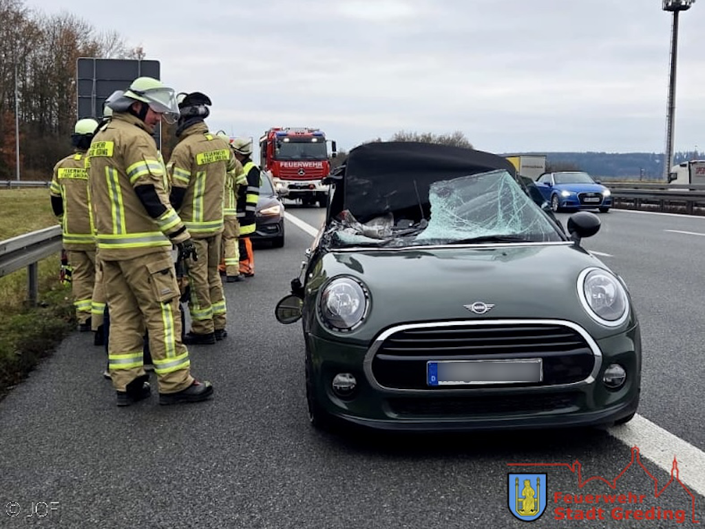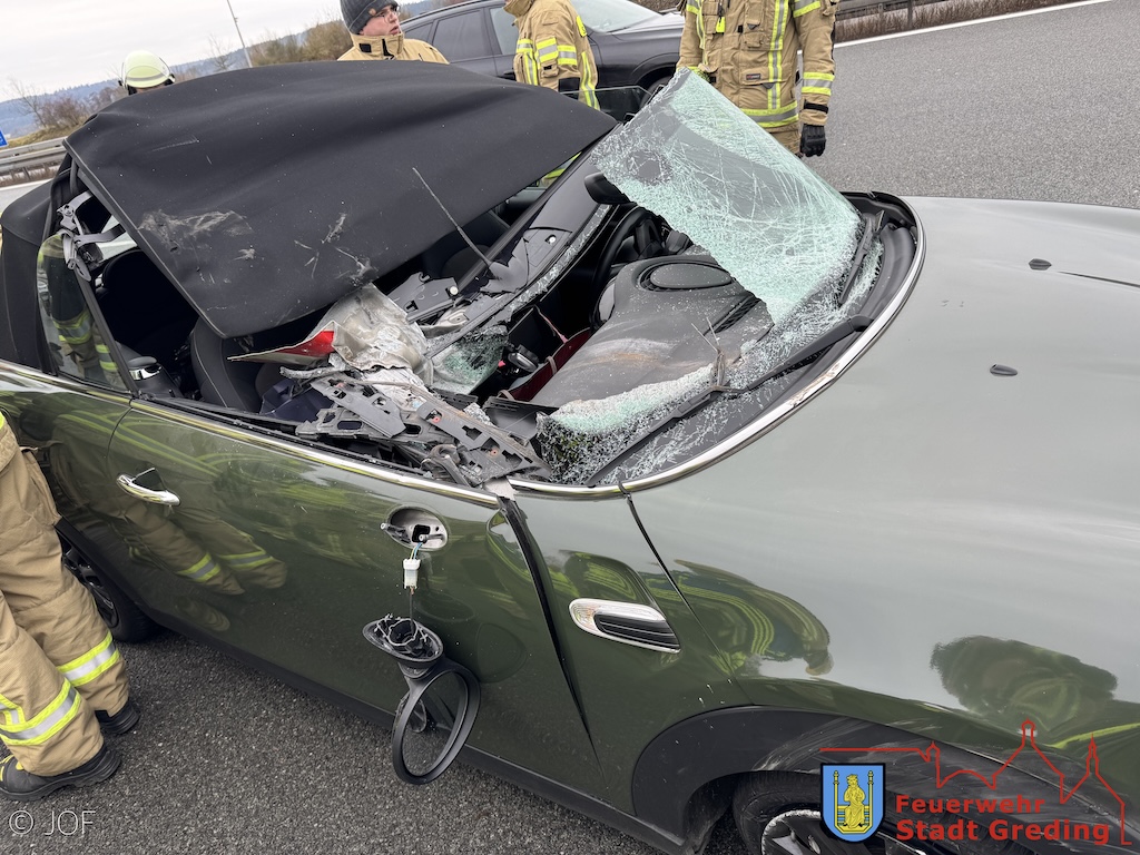 Zwischen den Anschlussstellen Greding und Hilpoltstein (Parkplatz Offenbau) in Fahrtrichtung Nürnberg kommt es zum Verkehrsunfall zwischen einem PKW und einem Schwerlasttransporter. Die Fahrerin des Mini kann das stark demolierte Fahrzeug selbstständig verlassen. Sie bleibt unverletzt.