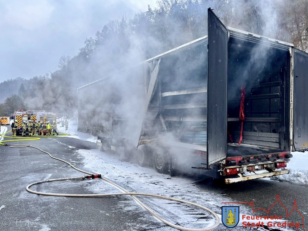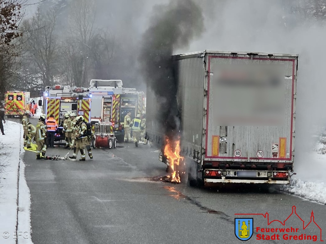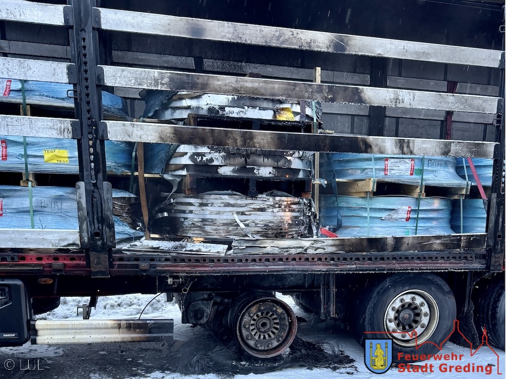 Ein Trupp unter Atemschutz kann das Feuer schnell bekämpfen und eine weitere Ausbreitung auf die gesamte Ladung verhindern. Um ungestört die Löschmaßnahmen durchführen zu können, wird der Parkplatz während den Arbeiten durch die Feuerwehr gesperrt. Im Einsatz waren neben der Feuerwehr Greding mit 25 Einsatzkräften, der Rettungsdienst, die Polizei und Vertreter der Kreisbrandinspektion des Landkreises Roth und Eichstätt.